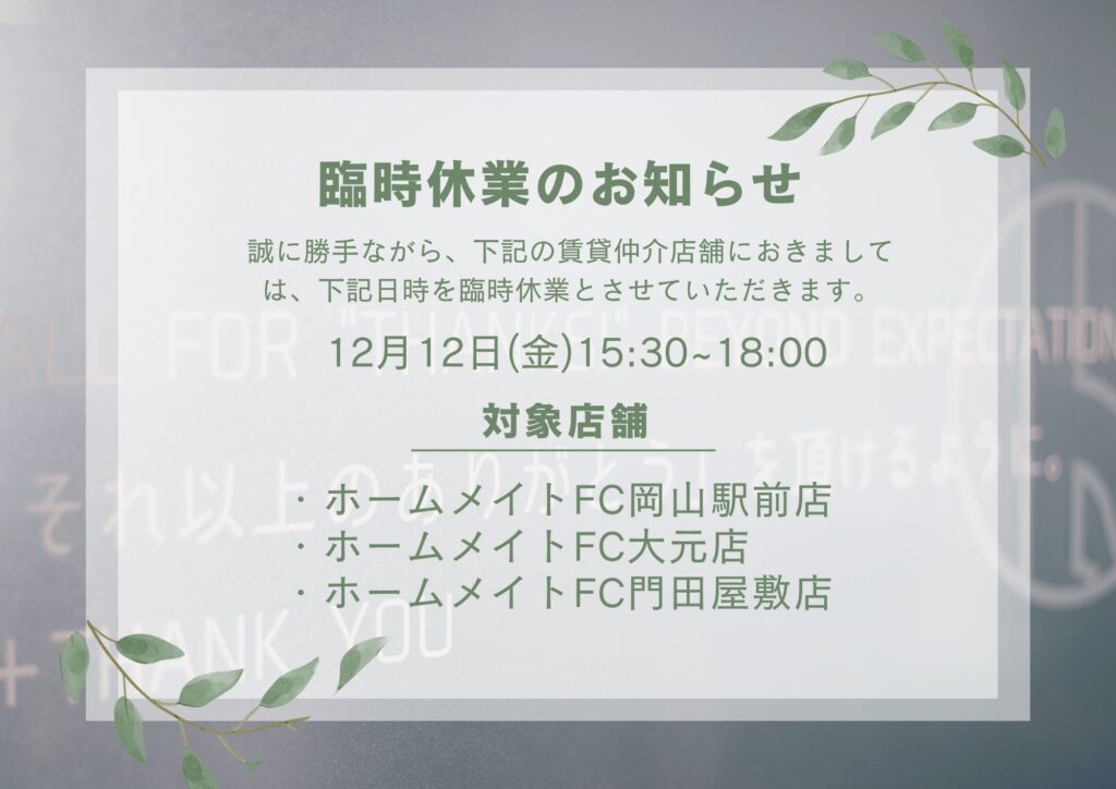 【2025年12月12日】 ホームメイトFC岡山エリア3店舗の臨時休業について【後楽不動産】