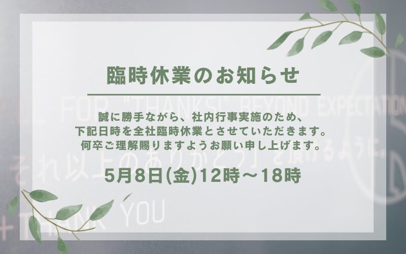 2026年5月8日(金)12時〜18時 | 社内行事に伴う臨時休業のお知らせ