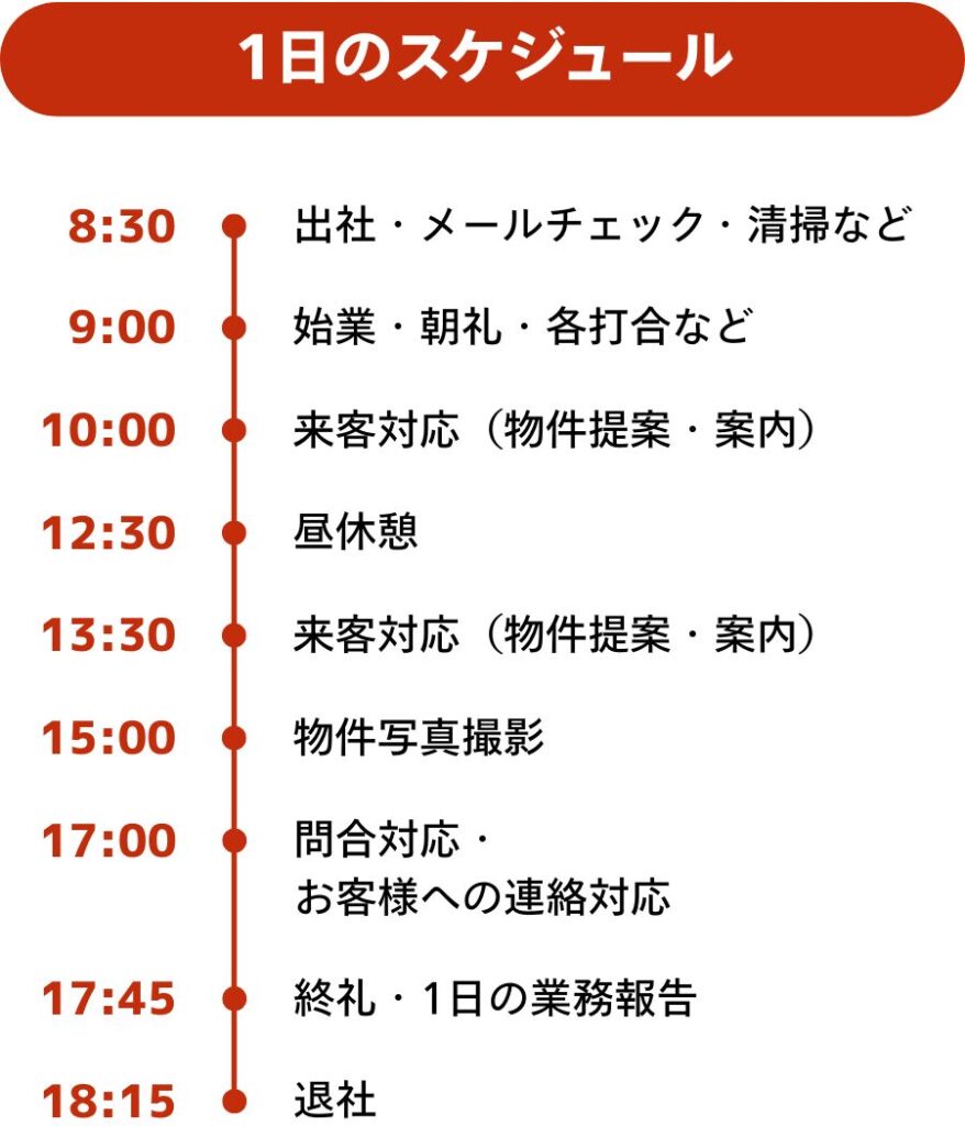 | 休日休暇 | 週休2日 ※定休日は会社カレンダーによる <売買事業部・管理事業部・経営企画本部> 隔週火曜日+毎週水曜日 +各自の年間休日に合わせた休日数 <賃貸事業部> 4月から12月:毎週水曜日 1から3月:完全シフト制 +各自の年間休日に合わせた休日数 ・年末年始休暇 ・GW休暇 ・有給休暇 ・誕生日休暇 ・産前産後休暇 ・育児休暇 ・介護休暇 ・慶弔休暇 |
