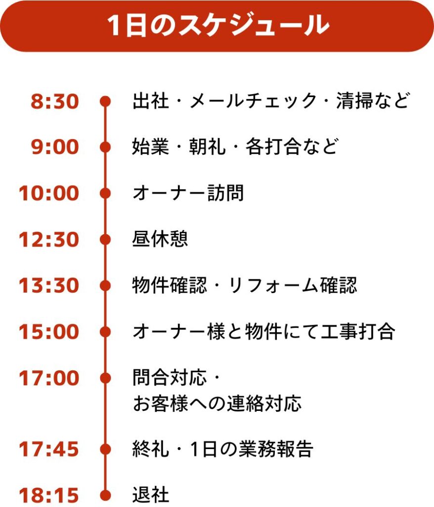 オーナー様の物件を、選ばれるお部屋にするため、リフォーム提案や募集のお手伝いをしています。また、退去時は入居者様とオーナー様の間に立ち、手続きや原状回復費用の説明・調整なども行っています。