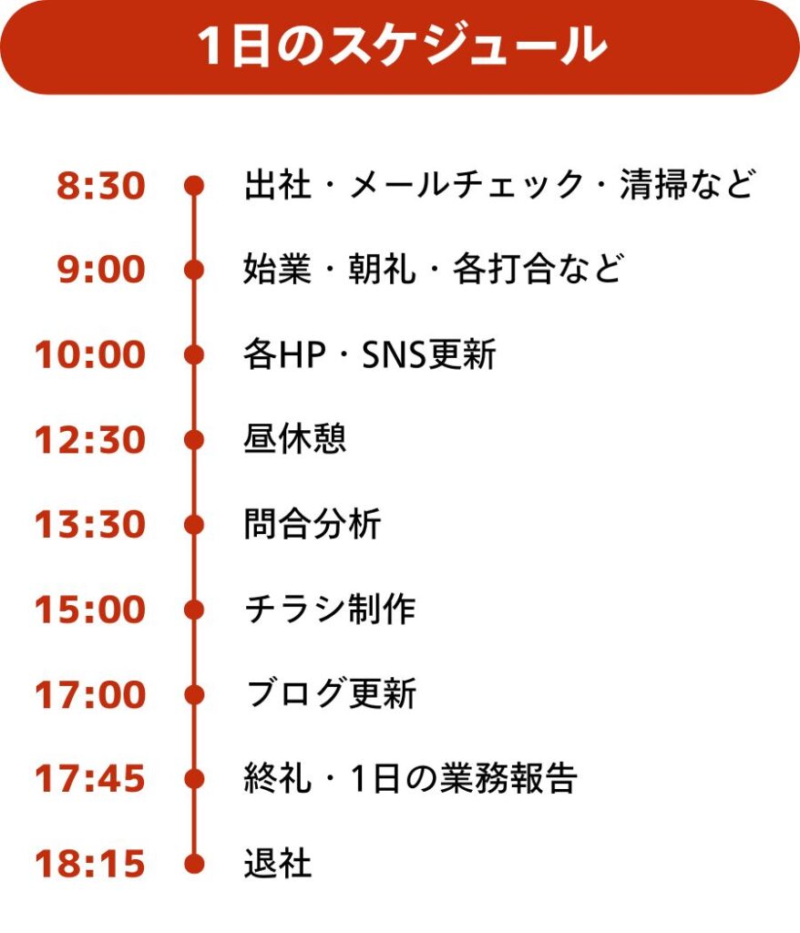 HPやSNSの更新、チラシやサイトのデザイン制作、ブログ発信などが主な業務内容です。また、情報発信の中心として、認知拡大と集客をサポートしています!