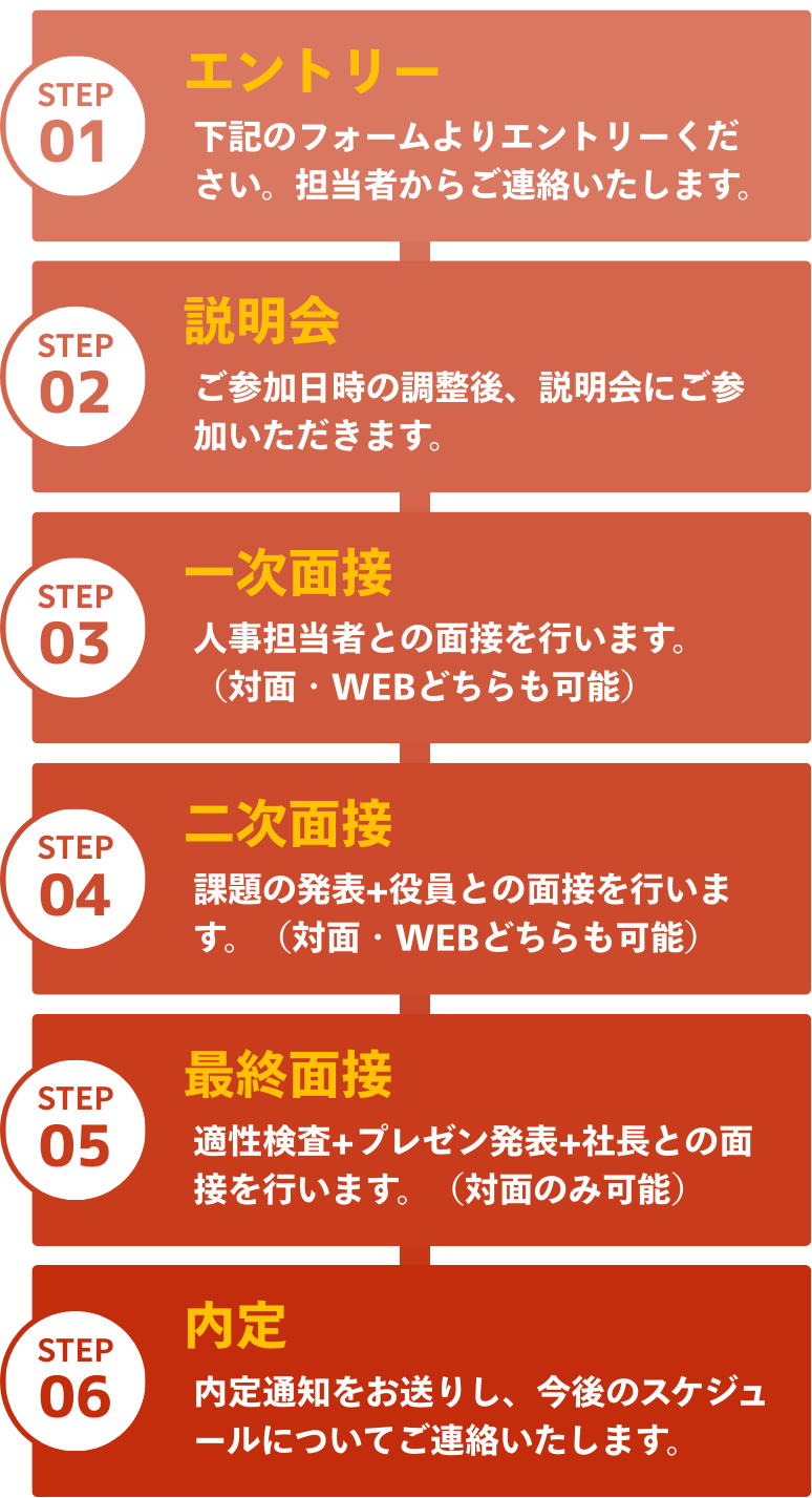 | 選考方法 | 面接2〜3回 ※人物重視の採用です! |