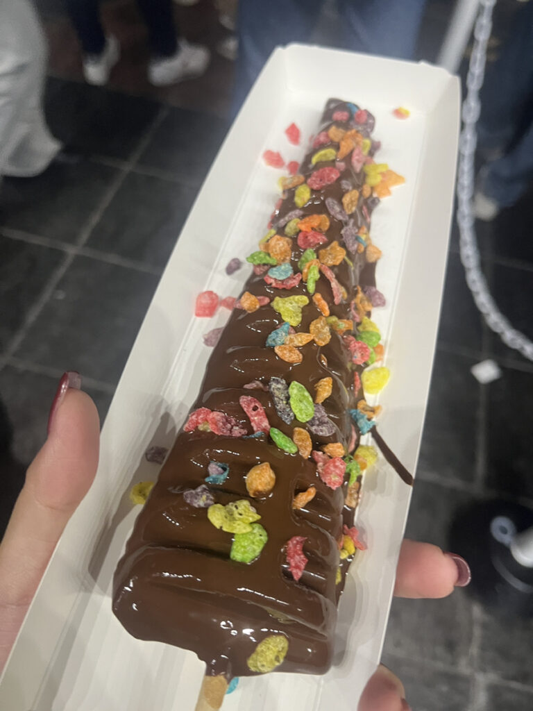 また、フードブースも充実していて、今回いただいたのがクリスマスツリーの形をしたワッフルです。見た目がとても可愛らしく、写真を撮りたくなるスイーツでした。甘さもちょうどよく、寒い中で食べるワッフルはとても美味しく感じられました。